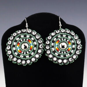 Zuni artist McKeffe made these beautiful beaded earrings. The beading is backed with a soft leather. 1 5/8″ wide x 1 5/8” tall With ear wires are 2 7/16” in length Artist card included Zuni Pueblo is the largest pueblo in New Mexico, and because of its...