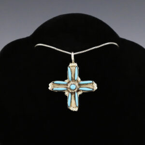 Zuni artists are known for their fine lapidary skills. This cross pendant is no exception. Zuni artist Cecelia Iule made this pendant out of sterling silver and Turquoise. Weighs 6 grams. (Chain not included) Signed. 1 1/8″ wide x 1 5/8” long Artist card included Zuni Pueblo...