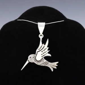 Wonderful Hummingbird pendant made out of sterling silver by Norman Woody. (Chain not included) A timeless beauty that you will enjoy for years to come. Weighs 12 grams. Signed 1 5/8” wide x 2 1/8” long Artist card included The Navajos began working with silver in the...