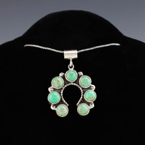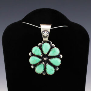 Lovely cluster pendant hand made out of sterling silver and Turquoise by Navajo artist Bobby Johnson. A timeless beauty that you will enjoy for years to come. Weighs 22 grams. Signed (Chain not included) 1 3/8” wide x 2 1/8” long Artist card included The Navajos began...