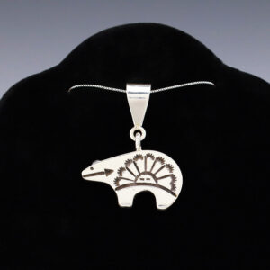 Wonderful Bear pendant made out of sterling silver by Norman Woody. (Chain not included) A timeless beauty that you will enjoy for years to come. Weighs 12 grams. Signed 1 1/4” wide x 1 1/2” long Artist card included The Navajos began working with silver in the...