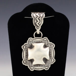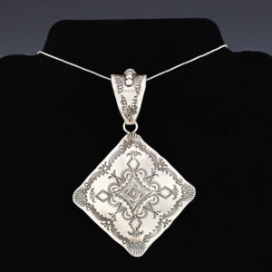 Navajo silversmith Vincent Platero handcrafted this beautiful pendant out of sterling silver. The pendant is hand stamped and has a satin finish. A timeless beauty that you will enjoy for years to come. Weighs 34 grams. Signed. (Chain not included) 2 3/4” wide x 4” long Artist card...
