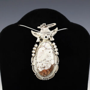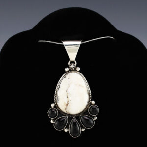 Lovely pendant hand made out of sterling silver, White Buffalo, and Onyx by Navajo artist Carol Wylie. A timeless beauty that you will enjoy for years to come. Weighs 14 grams. Signed (Chain not included) 1 1/4” wide x 2 5/16” long Artist card included The Navajos...