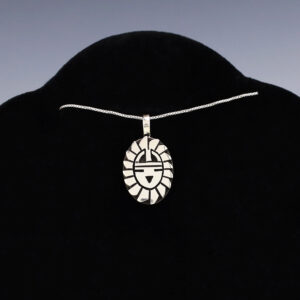 Zuni artists Raylan and Patty Edaakie made this gorgeous Sun Face pendant. The pendant is sterling silver and inlaid with Turquoise, Coral, Mother of Pearl Shell, and Jet. For the Zunis, the Sun symbolizes abundance, positive energy, happiness and peace. This pendant will elevate your jewelry collection and is so...