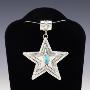 Fabulous star pendant made out of sterling silver and Turquoise by Navajo artist June Delgarito. A timeless beauty that you will enjoy for years to come. Weighs 14 grams. (Chain not included) Signed 2 1/8” wide x 2 3/4” long Artist card included The Navajos began working...