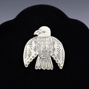 Fabulous Thunderbird pin made out of sterling silver by Navajo artist Limbert Perry. A timeless beauty that you will enjoy for years. Weighs 10 grams. Signed 1 9/16” wide x 1 9/16” long Artist card included The Navajos began working with silver in the 19th century, and...
