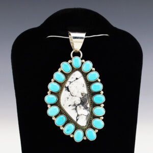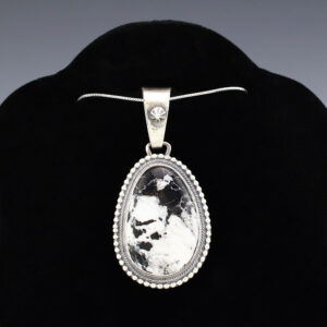 Gorgeous pendant hand made out of sterling silver and White Buffalo by Navajo artist Daniel Benally. A timeless beauty that you will enjoy for years to come. Weighs 16 grams. Signed (Chain not included) 1 1/16” wide x 2 1/16” long Artist card included The Navajos...