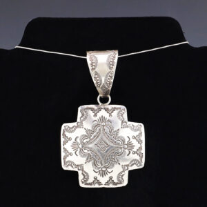 Navajo silversmith Vincent Platero handcrafted this beautiful cross pendant out of sterling silver. The pendant is hand stamped and has a satin finish. A timeless beauty that you will enjoy for years to come. Weighs 26 grams. Signed. (Chain not included) 2 1/16” wide x 3 1/4” long ...