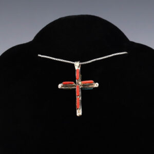Beautiful cross pendant. One side is set with Coral and the other side is set with Turquoise. Zuni artists are known for their fine lapidary skills. Each stone is hand cut, polished, and set into a sterling silver setting. Weighs 2 grams. (Chain not included) 7/8” wide x 1 ...