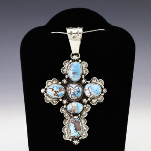 Wonderful cross pendant hand made out of sterling silver and Turquoise by Navajo artist Leonard Maloney. A timeless beauty that you will enjoy for years to come. Weighs 16 grams. Signed (Chain not included) 1 15/16” wide x 2 15/16” long Artist card included The Navajos began...