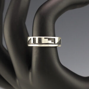 Hopi artist Darren Seweyestewa created this wonderful ring through the overlay technique. Hopi overlay is constructed from two layers of sterling silver. A design is cut out with a jeweler’s saw by hand. This top design layer is then silver soldered to another sheet, the bottom layer, of silver. Texturing...