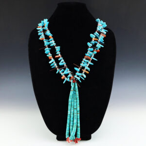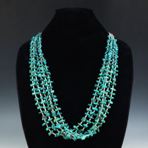 Amazing color combination! This five strand vintage necklace is a lovely statement piece. The necklace showcases Shell and Turquoise nuggets. The strands of heishi are finshed with sterling silver cones, and a hook and eye. Weighs 188 grams. Necklace-1/8″ wide to 5/8″ wide 33” long The Navajos began...