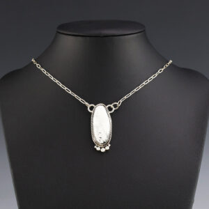 Navajo artist Marcella James made this lovely necklace. Sterling silver with a White Buffalo stone. This necklace will elevate your jewelry collection and is so versatile, it will look great with any outfit. Weighs 14 grams. Signed Necklace-18 1/2″ in length stone-5/8 wide x 1 7/16″ long Artist...