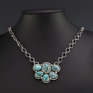 Navajo artist Danny Henio made this beautiful necklace. Sterling silver with a New Lander Variscite stone. This necklace will elevate your jewelry collection and is so versatile, it will look great with any outfit. Weighs 12 grams. Signed Necklace-18 5/8″ total length Artist card included The Navajos...