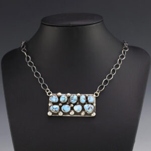 Navajo artist Joelias Draper made this beautiful necklace. Sterling silver with Golden Hills Turquoise stones. This necklace will elevate your jewelry collection and is so versatile, it will look great with any outfit. Weighs 32 grams. Signed Necklace-19″ total length stones-1″ wide x 1 7/8″ long Artist card...