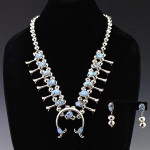 Gorgeous sterling silver squash blossom necklace. The squash blossoms and the naja are set with Golden Hills Turquoise stones. The necklace is strung with sterling silver 12 mm bench beads. The necklace is finished off with a sterling silver hook and eye. Comes with matching earrings. A timeless beauty that...