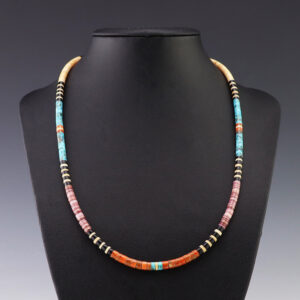 Amazing color combination! Kewa artist Lupe Lovato hand crafted this gorgeous necklace out of Turquoise and Spiny Oyster. Traditionally made by hand cutting, drilling, rolling, and stringing. Weighs 72 grams. A timeless beauty that you will enjoy for years to come. 3/16″ to 7/16″ wide 21 1/4” long ...