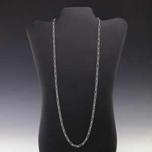 Zuni artist Carlo Lonjose made this fabulous paperclip chain. Sterling silver and a heavy gauge. An exquisite statement piece that you will enjoy for many years. The necklace weighs 84 grams. Signed 5/16″ wide x 3/4″ long-links 36” long-Necklace Artist card included Zuni Pueblo is the largest pueblo...