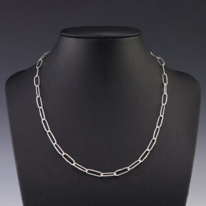 Zuni artist Carlo Lonjose made this fabulous paperclip chain. Sterling silver and 16 gauge round wire. An exquisite statement piece that you will enjoy for many years. The necklace weighs 12 grams. Signed 1/4″ wide x 9/16″ long-links 18” long-Necklace Artist card included Zuni Pueblo is the largest...