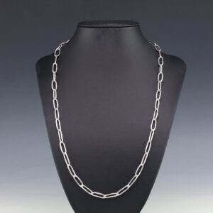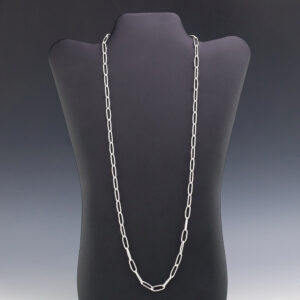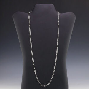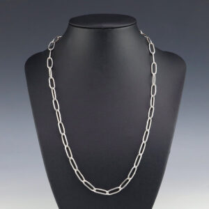 Zuni artist Carlo Lonjose made this fabulous paperclip chain. Sterling silver and 16 gauge round wire. An exquisite statement piece that you will enjoy for many years. The necklace weighs 16 grams. Signed 1/4″ wide x 9/16″ long-links 22” long-Necklace Artist card included Zuni Pueblo is the largest...