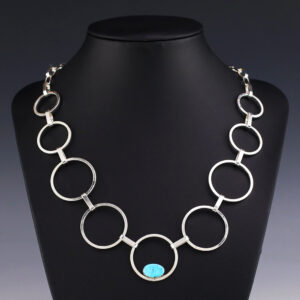 Zuni artists Nancy and Sheldon Westika made this gorgeous necklace. Sterling silver with a Turquoise Stone. The Westikas are know for their great stone work. An exquisite statement piece that you will enjoy for many years. Weighs 28 grams. Signed 1 1/16″ wide x 20” long Artist card...