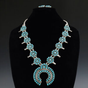 Zuni artists are known for their fine lapidary skills. Each stone is hand cut, polished, and set into a sterling silver setting. Zuni jeweler Diane Lonjose made this stunning butterfly necklace. Sterling silver with natural Kingman Turquoise. The components are all hand fabricated, and the stones are all natural. Diane...