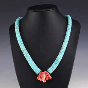 Amazing color combination! Kewa artist Lupe Lovato hand crafted this gorgeous necklace out of Turquoise and Spiny Oyster. Traditionally made by hand cutting, drilling, rolling, and stringing. Weighs 74 grams. A timeless beauty that you will enjoy for years to come. 3/16″ to 7/8″ wide 20 1/2” long ...