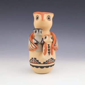This wonderfully painted storyteller was handmade by Jemez Pueblo potter Chrislyn Fragua and depicts an owl with two owlets. Chrislyn uses both the coil method and pinch method to create her pottery piece and as in traditional storytellers, Chrislyn’s storytellers have their mouths open. Storytellers represent the passing down of...