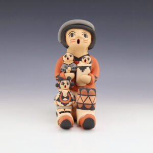 This wonderfully painted storyteller was handmade by Jemez Pueblo potter Chrislyn Fragua and depicts a woman with four children and a drum. Chrislyn uses both the coil method and pinch method to create her pottery piece and as in traditional storytellers, Chrislyn’s storytellers have their mouths open. Storytellers represent the...