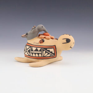 This wonderfully painted storyteller was handmade by Jemez Pueblo potter Chrislyn Fragua and depicts a frog and a turtle. Chrislyn uses both the coil method and pinch method to create her pottery piece and as in traditional storytellers, Chrislyn’s storytellers have their mouths open. Storytellers represent the passing down of...