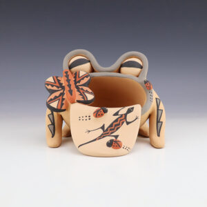 This wonderfully painted storyteller was handmade by Jemez Pueblo potter Chrislyn Fragua and depicts a frog adorned with ladybugs, a butterfly, and a lizard. Chrislyn uses both the coil method and pinch method to create her pottery piece and as in traditional storytellers, Chrislyn’s storytellers have their mouths open. Storytellers...