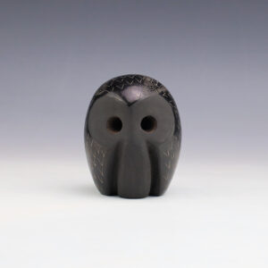Exquisite Black-on-Black pottery owl by Merton Sisneros of the Okhuwa Ping Studio at Santa Clara Pueblo. Merton makes pottery in the traditional way that was taught by his family. He has won many awards for workmanship, and is well known throughout New Mexico. The Owl is a messenger, and the...