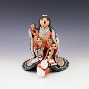 This wonderfully painted storyteller was handmade by Jemez Pueblo potter Chrislyn Fragua and depicts a woman with four children and a drum. Chrislyn uses both the coil method and pinch method to create her pottery piece and as in traditional storytellers, Chrislyn’s storytellers have their mouths open. Storytellers represent the...