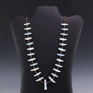 Zuni artists Nancy and Sheldon Westika created this exquisite fetish necklace. The birds are hand carved out of Angelite. There is fine Olive Shell in between the fetish and at the ends. This beautiful strand is finished off with a sterling silver clasp and cones. A statement piece that you...