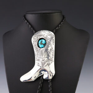 NAVAJO STERLING SILVER & TURQUOISE COWBOY BOOT BOLO TIE BY SHIRLEY SKEETS