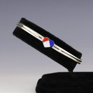 Zuni artist Linda Chavez made this lovely heart bracelet. Zuni artists are known for their fine lapidary skills. Each stone is hand cut, polished, and set into a sterling silver setting. This lovely bracelet is sterling silver and inlaid with Lapis, Mother of Pearl Shell, and Coral. Weighs 6 grams. ...