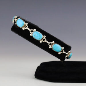 Zuni jeweler Diane Lonjose hand crafted this lovely link bracelet. The bracelet is sterling silver and is set with natural Kingman Turquoise stones. The components are all hand fabricated, and the stones are all natural. Diane comes from a family of Zuni jewelers. She is the daughter of Alice and...