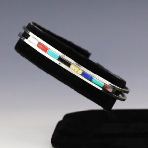 Zuni artists Anson and Leticia Wallace made this beautiful bracelet. Zuni artists are known for their fine lapidary skills. Each stone is hand cut, polished, and set into a sterling silver setting. The bracelet is sterling silver and inlaid with Turquoise, Coral, Mother of Pearl Shell, Pink Mussel, Jet, and...