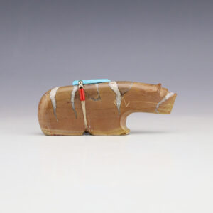Zuni bear fetishes represent healing and strength. This wonderful bear fetish is made out of a New Mexico Calcite Nodule by Zuni artist Todd Westika. It is adorned with Turquoise, Coral, and silver. This fetish showcases the graceful lines and sculptural quality of Todd’s carvings. A great addition to your...
