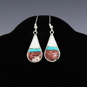 Zuni artist Diane Lonjose made these wonderful earrings. Made out of sterling silver and set with natural Spiny Oyster, Jet, and Turquoise. Zuni artists are known for their lapidary work. Weighs 8 grams. Signed 5/16″ wide x 2 7/8” tall Artist card included Zuni Pueblo is the largest pueblo in...