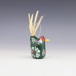 These colorful Navajo folk art chickens are hard to resist. Les Herbert hand carves his folk art pieces out of cottonwood and hand paints them. 4” tall x 2 5/8” long x 1 5/8” wide (height is to top of straw tail) Artist card included In recent years, wood figurines...