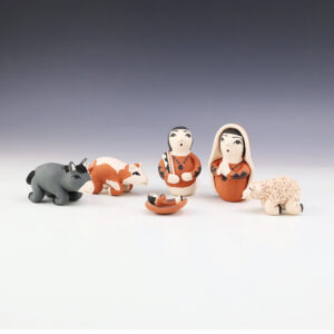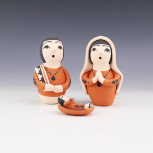 Kewa potters, Angel and Ralph made this lovely Nativity. Traditionally made and fired using an outdoor kiln. Alluring colors and patterns. This Nativity would be a wonderful addition to your collection of Native American art or pottery. Signed. Mary, Joseph, Shepard, & Wisemen- 2 5/8″ tall x 2 1/2″ long ...