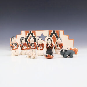 Kewa potters, Angel and Ralph made this lovely Nativity. Traditionally made and fired using an outdoor kiln. Alluring colors and patterns. This Nativity would be a wonderful addition to your collection of Native American art or pottery. Signed. Mary, Joseph, Shepard, & Wisemen- 2 1/8″ tall x 1 1/8″ long ...