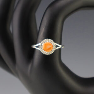 This ring is a great representation of hand made Navajo jewelry and will make a statement on your hand. Spiny Oyster is set into a sterling silver setting. Made by Navajo artist Priscilla Smith. Weighs 6 grams. Size 9. Signed 3/4″ wide x 3/4″ long Artist...