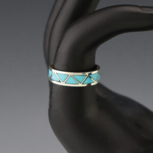Zuni artists are known for their fine lapidary skills. Each stone is hand cut, polished, and set into a sterling silver setting. The ring is set with Turquoise stones. Hand made by Zuni artist Irma Unkestine. Weighs 2 grams. Size 7 1/2. 3/16″ wide Artist card included ...