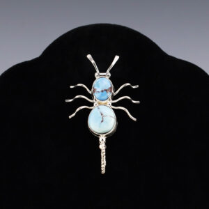 Zuni artists are known for their fine lapidary skills. Each stone is hand cut, polished, and set into a sterling silver setting. Zuni jeweler Diane Lonjose made this breathtaking Dragonfly pendant. Sterling silver with natural Sonoran Gold Turquoise and Fox Turquoise. This can be worn as a pendant or pin. ...