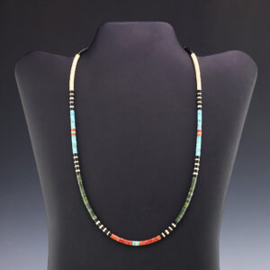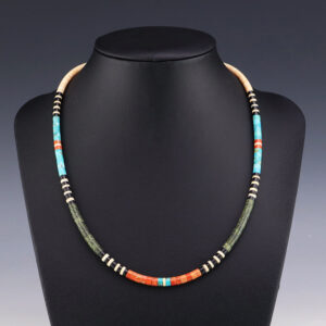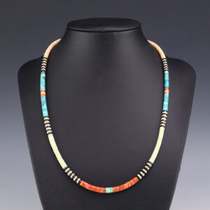 Santo Domingo artist Lupe Lovato hand crafted this lovely necklace out of White Clam Shell, Spiny Oyster, Mohave Turquoise, Mother of Pearl Shell, and Turquoise. Traditionally made by hand cutting, drilling, rolling, and stringing. Weighs 46 grams. A timeless beauty that you will enjoy for years to come. 1/8″ to...