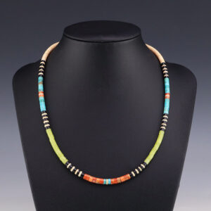 This necklace, hand made by Kewa artist Jeanette Calavaza, is a lovely statement piece. The necklace showcases fine Olive Shell, Spiny Oyster, and Turquoise. The strand of heishi is finished off with a hook and eye. Weighs 12 grams. 1/8″ wide to 1/4″ wide 18” long Artist...
