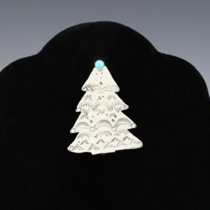 Navajo silversmith Lucille Platero made this fabulous Christmas Tree pin out of sterling silver and Turquoise. A timeless beauty that you will enjoy for years to come. Weighs 4 grams. 1 5/16” wide x 1 5/8” long Artist card included The Navajos began working with silver in...