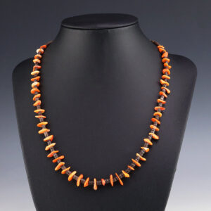Amazing color combination! Kewa artist Lupe Lovato hand crafted this gorgeous necklace out of Turquoise and Spiny Oyster. Traditionally made by hand cutting, drilling, rolling, and stringing. Weighs 72 grams. A timeless beauty that you will enjoy for years to come. 3/16″ to 7/16″ wide 21 1/4” long ...